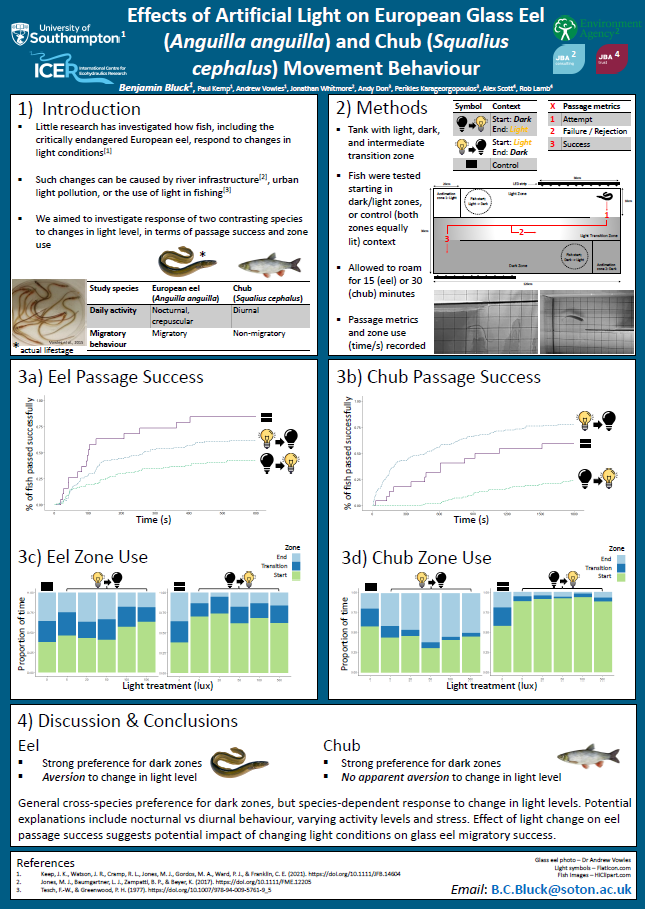 Through behavioural choice experiments and passage success assessments, Ben’s research investigated the response of two contrasting species to changes in light level, the critically endangered European Glass Eel (Anguilla anguilla) and Chub (Squalius cephalus).
